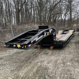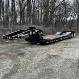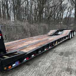 The 50 GSL-3 is a 50-ton hydraulic detachable lowboy. The load capacity is 100,000 lbs., and has a GVWR of 120,500 lbs. Spring brakes are on all axles. It has 4 beams 16″ deep cambered I-beam mainframe and side rails. 10″ steel crossmembers pierced through mainframe. The axles are 25,000 lb., 5″ diameter (3/4″ Wall), maximum track width. The 50GSL comes with 255/70R 22.5 radial tires. The Cush Air Ride Suspension has 75,000# capacity, and an air lift 3rd axle.
