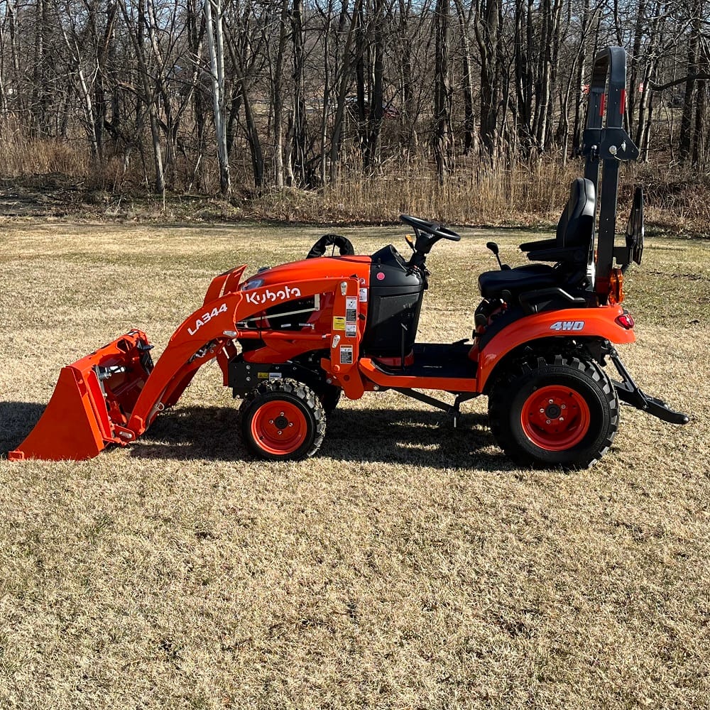 NEW Kubota BX2380RV-1 4WD Compact Tractor with LA344S Front Loader, 48″ Quick Attach Loader Bucket with bolt on edge and R4 Industrial Tires. Smaller than a full-size tractor and easier to operate, the sub-compact BX80 Series has the power and versatility to take on your toughest gardening, landscaping, and property maintenance jobs. A fuel-efficient 3-cylinder diesel engine provides plenty of power to haul, climb, and pull your way through even the most challenging tasks. The new optional 2-lever quick coupler on the loader, combined with Land Pride’s 3-point quick hitch system, lets you hook up to more front and rear implements, letting you handle a wider range of jobs. The BX Series even makes maintenance easier with a hood that fully opens to provide quick access to all serviceable areas of the engine.